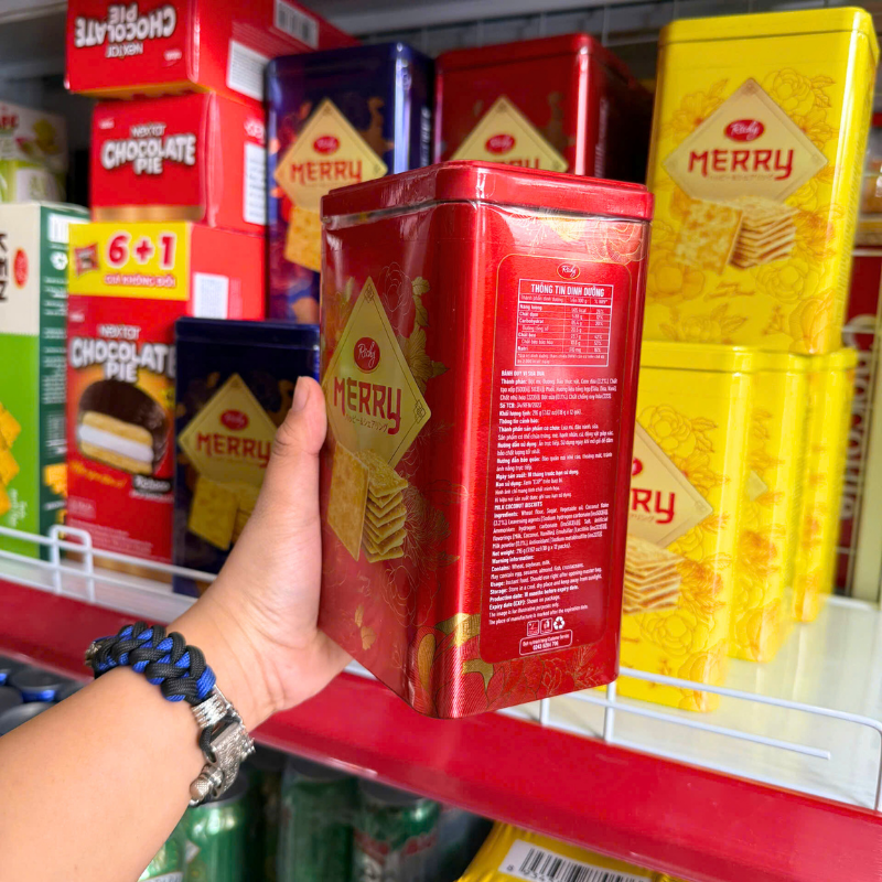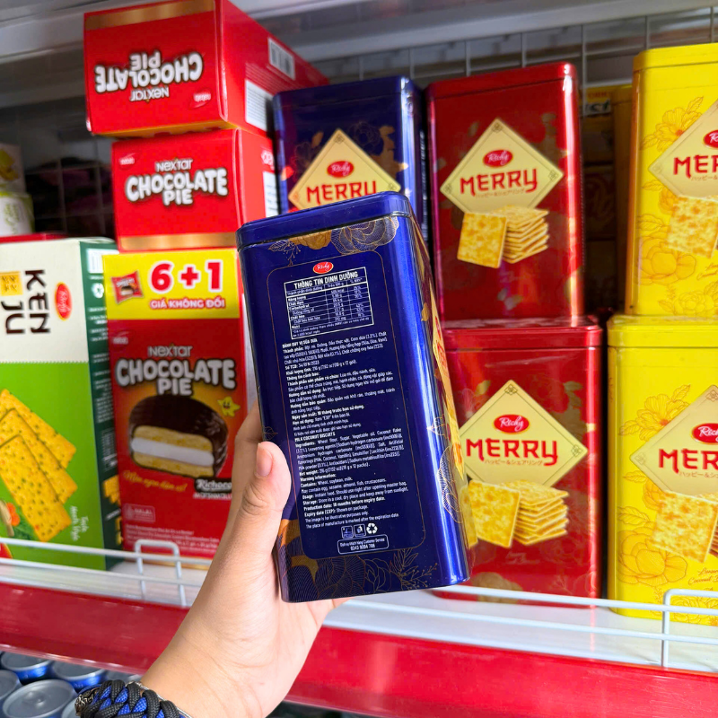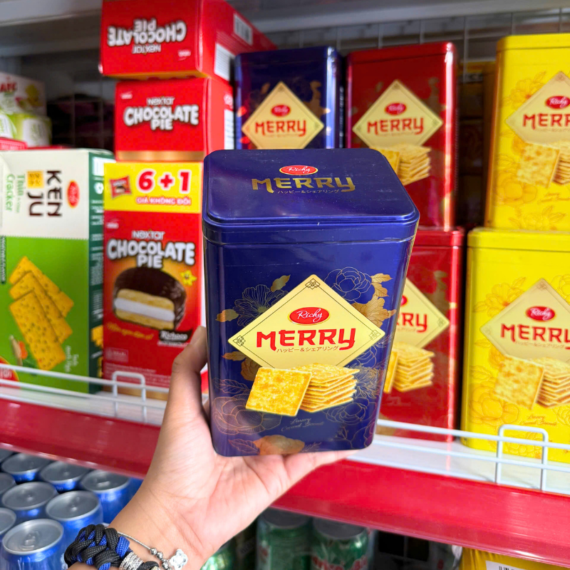 Bánh Quy Đường RICHY MERRY Thiếc Hình Trụ 156g (3 Màu Xanh Dương/ Vàng/ Đỏ)