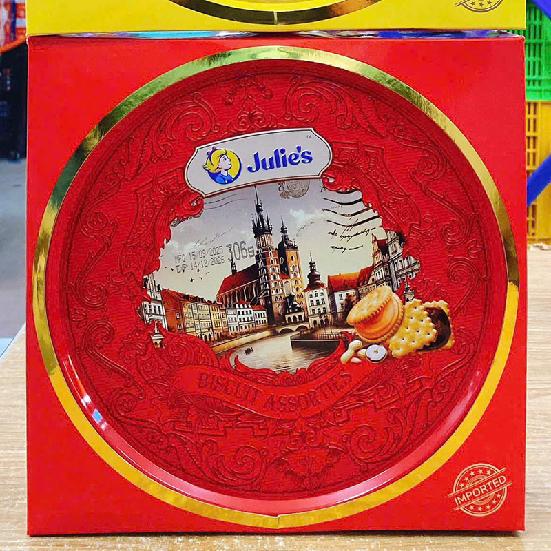 Bánh Quy JULIE’S Nhân Bơ Đậu Phộng Hộp Thiếc Phong Cảnh 306g – Hộp Màu Đỏ