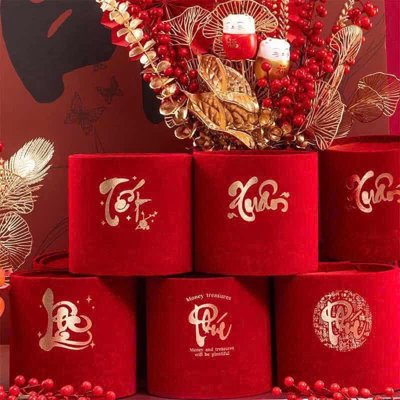 Trụ nhung đỏ là một trong những phụ kiện trang trí Tết bán chạy nhất vì độ sang trọng và tính ứng dụng cực cao. Màu đỏ nhung nổi bật, kết hợp họa tiết thư pháp ánh vàng tạo cảm giác ấm áp – may mắn – tràn đầy tài lộc khi bước vào năm mới.