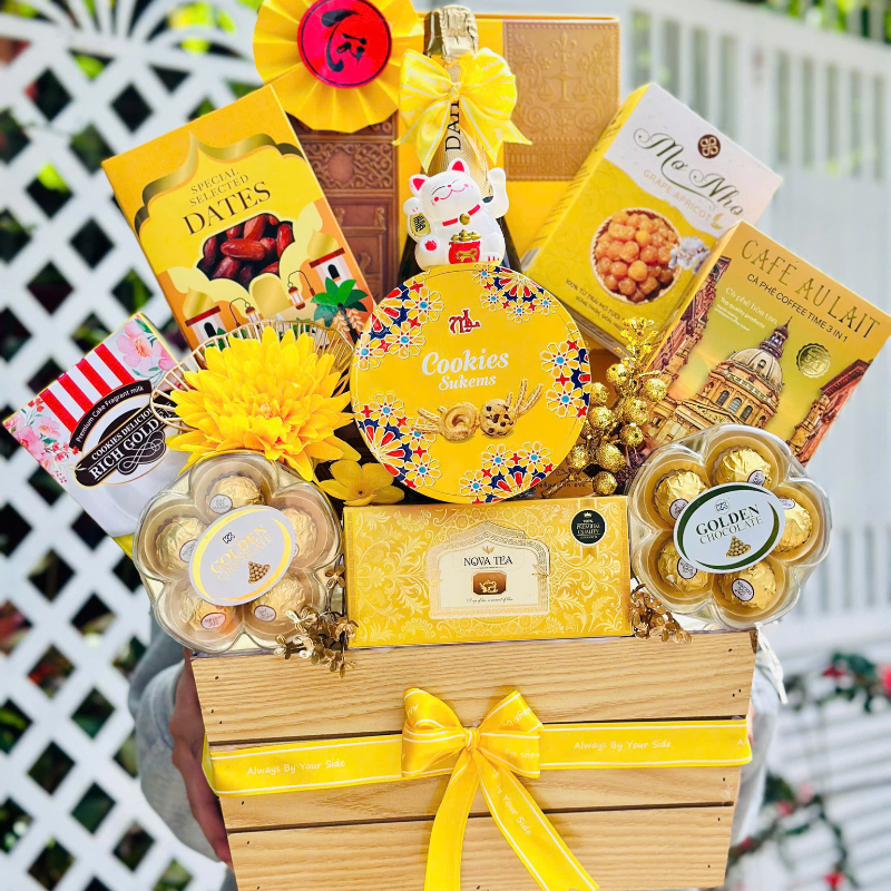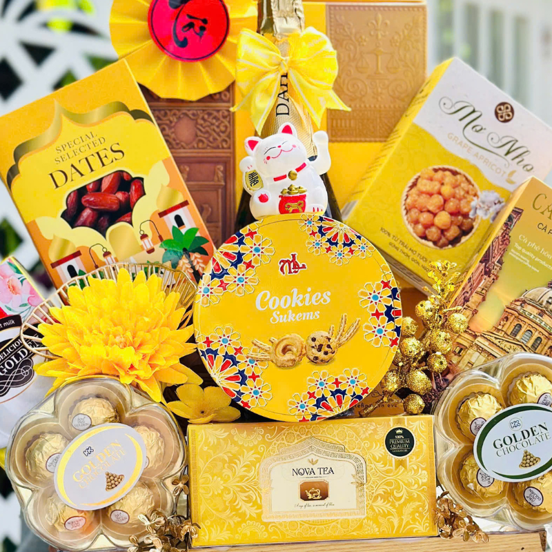Tết đến là dịp mình gửi nhau những điều tốt lành nhất. Một giỏ quà đẹp – đầy – đồng màu như thế này không chỉ là bánh kẹo, mà là lời chúc sung túc – ấm áp – thịnh vượng gửi đến người nhận.