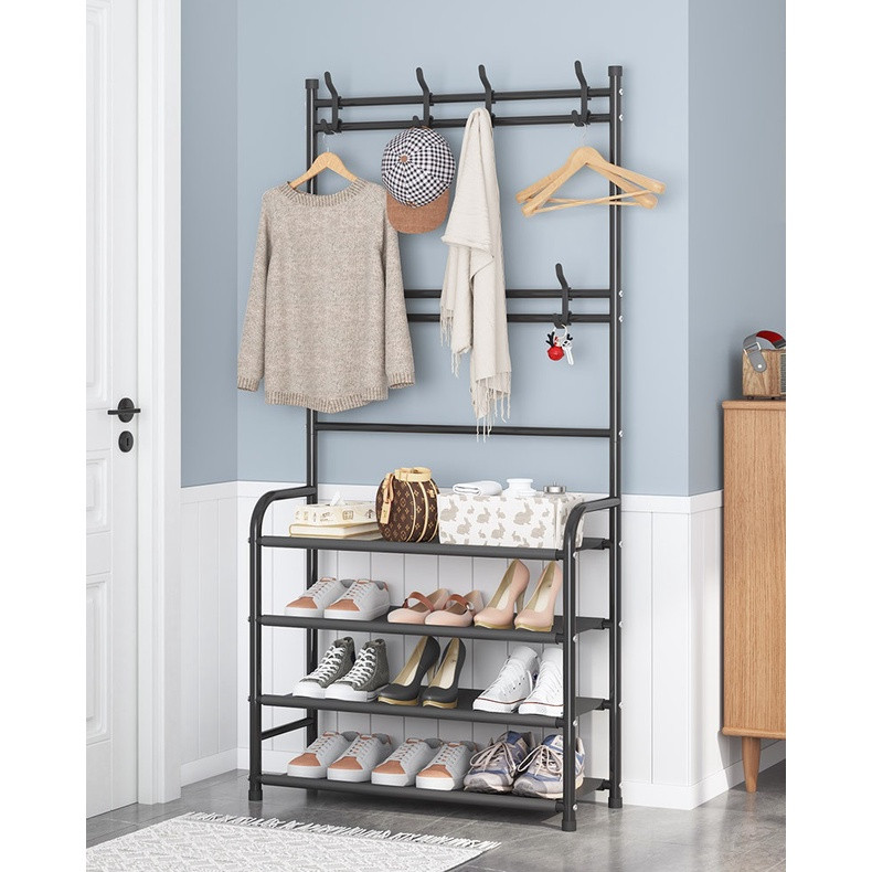 Kệ để giày dép đa năng 4 tầng có móc treo có thiết kế đa năng cơ bản chính vẫn là để giày dép nhưng có thiết kế thêm giá treo đồ bên trên rất tiện lợi, họa văn dễ thương với 3,4, tầng dễ dàng lắp ráp tháo rời, bảo vệ giày dép được cất giữ gọn gàng ngăn nắp.