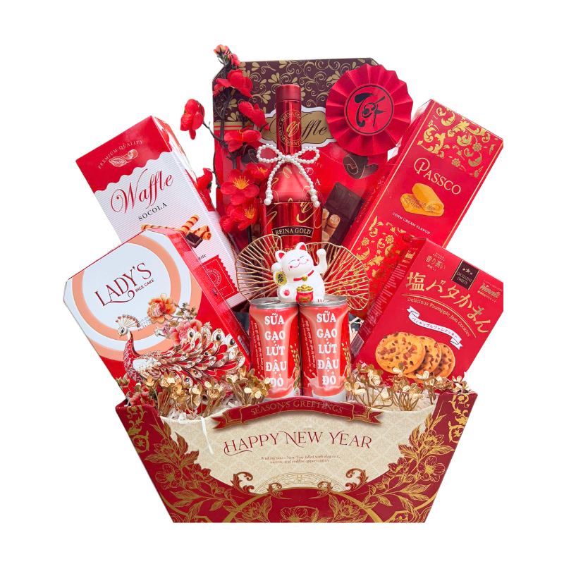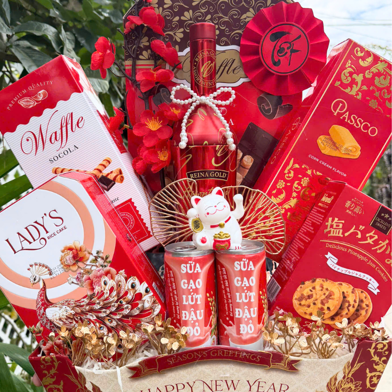 Giỏ 7 món lên form Đỏ – Vàng – Xanh, nhìn vào là thấy không khí Tết liền.
