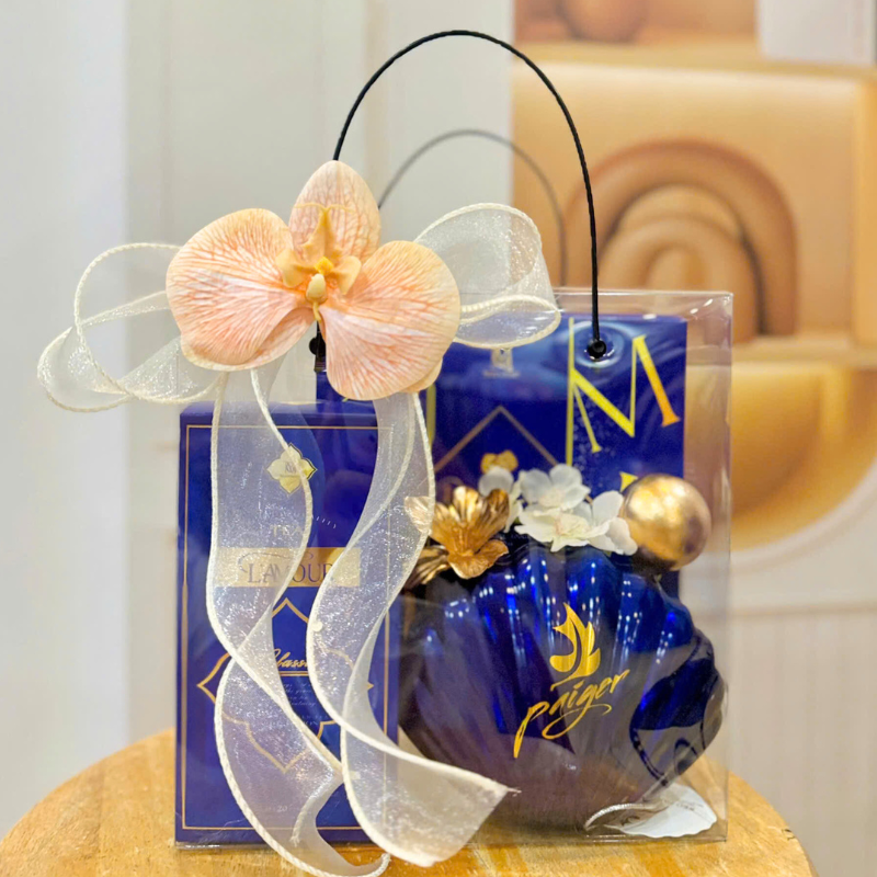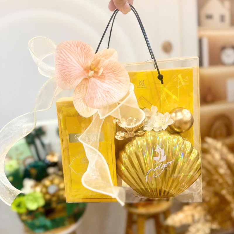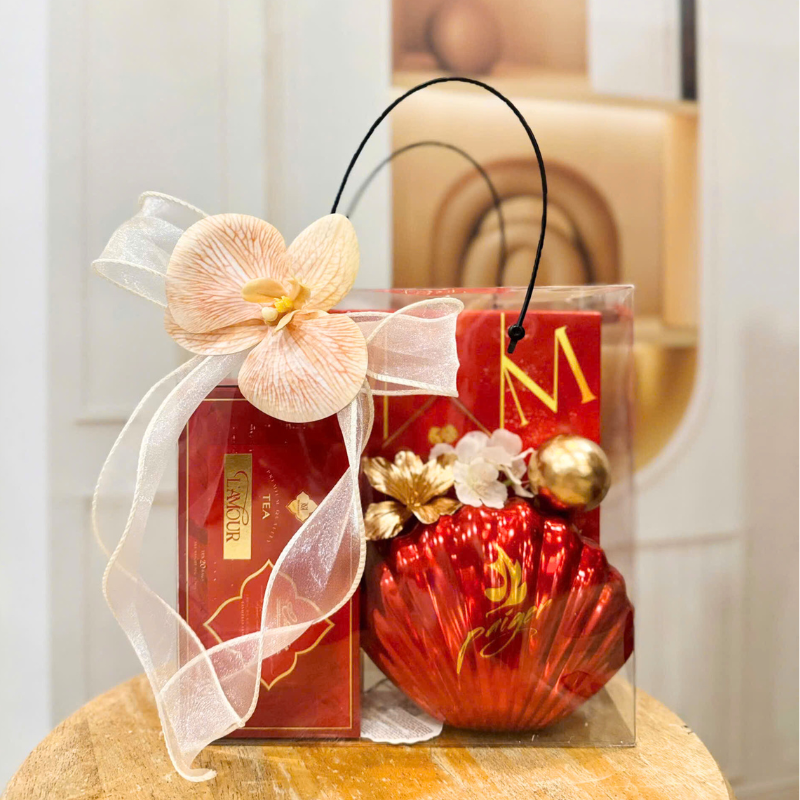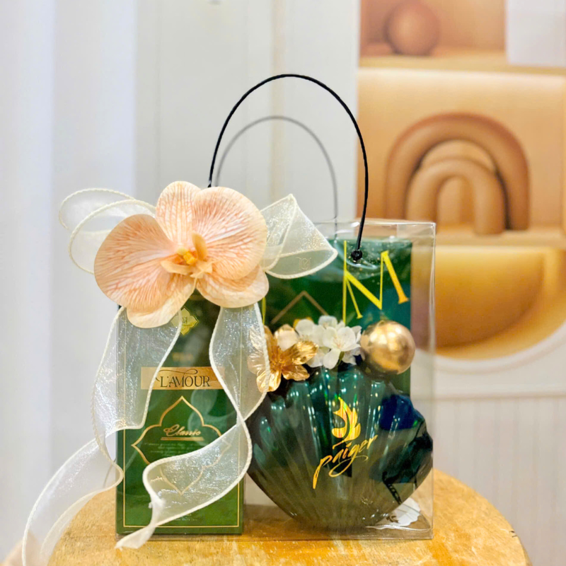 🌸 Nổi bật nhất là túi hộp mica trong suốt, phối nơ voan + hoa lan rất sang trọng. Chỉ cần cầm lên là có cảm giác “quà này được chọn rất có tâm”.
