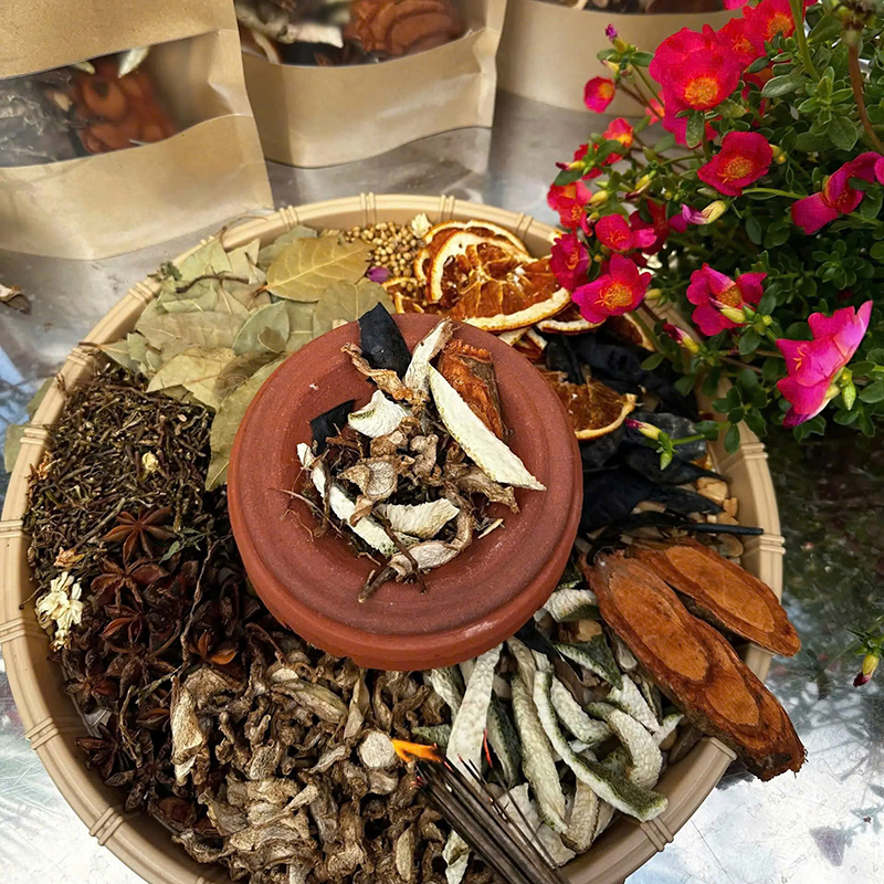 – Khi than hồng, lần lượt đổ thảo dược và muối vào khay than cho cháy âm ỉ tạo nên khói.