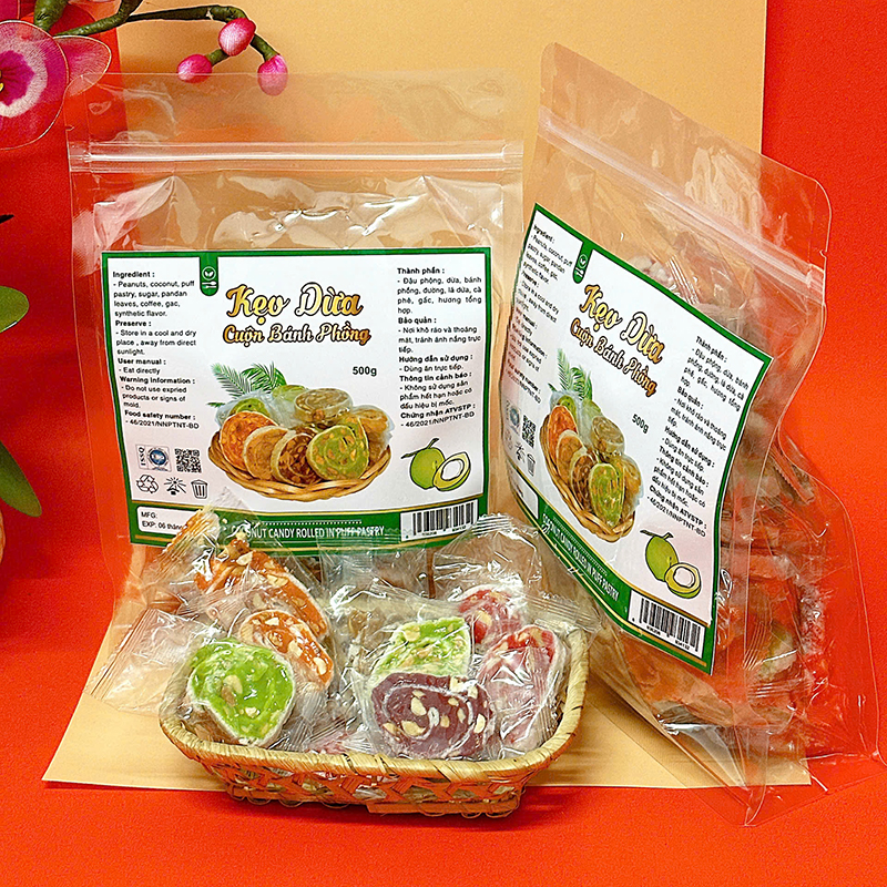 THÀNH PHẦN: Đậu phộng, đường, dừa, banh phồng, lá dứa, cà phê, gất,…