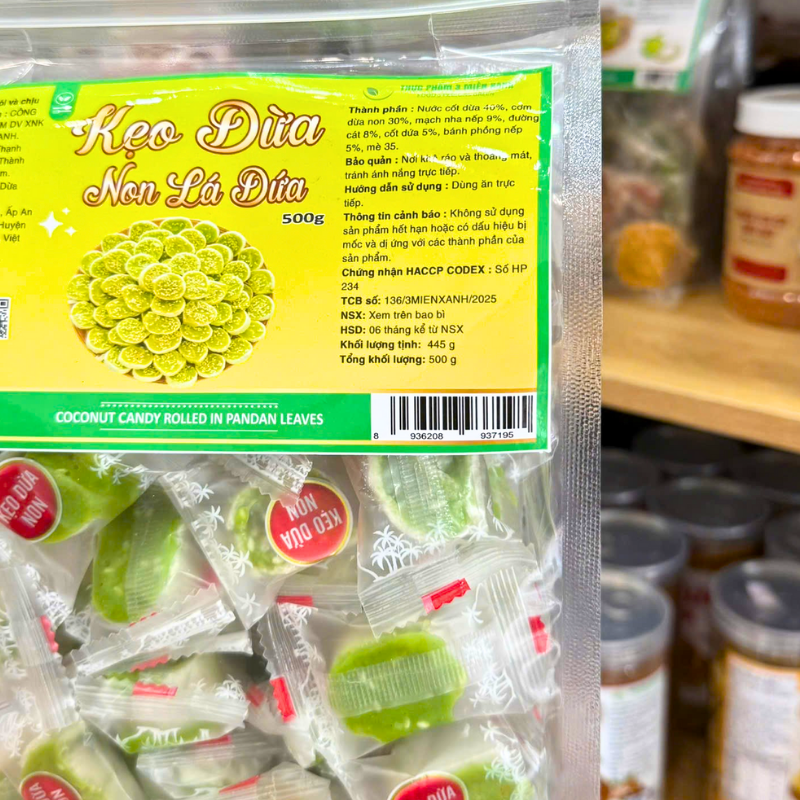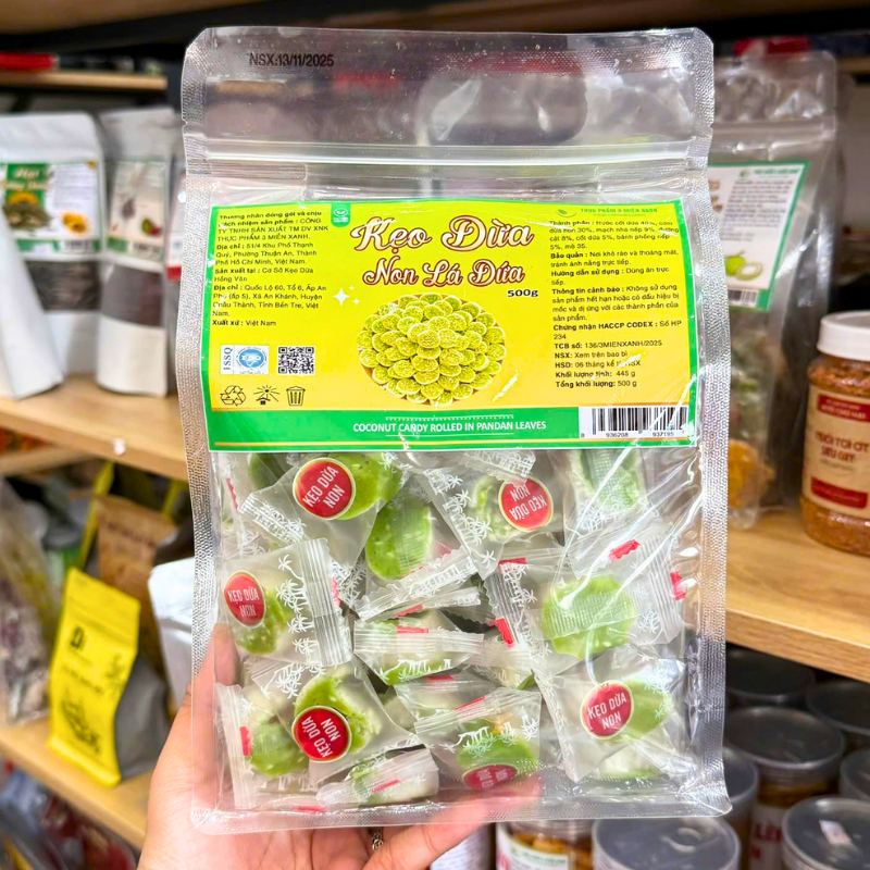 Kẹo Dừa Non Lá Dứa 500g – Túi Zip Trong
