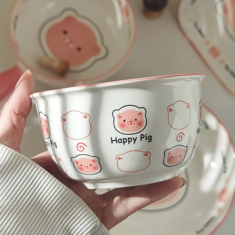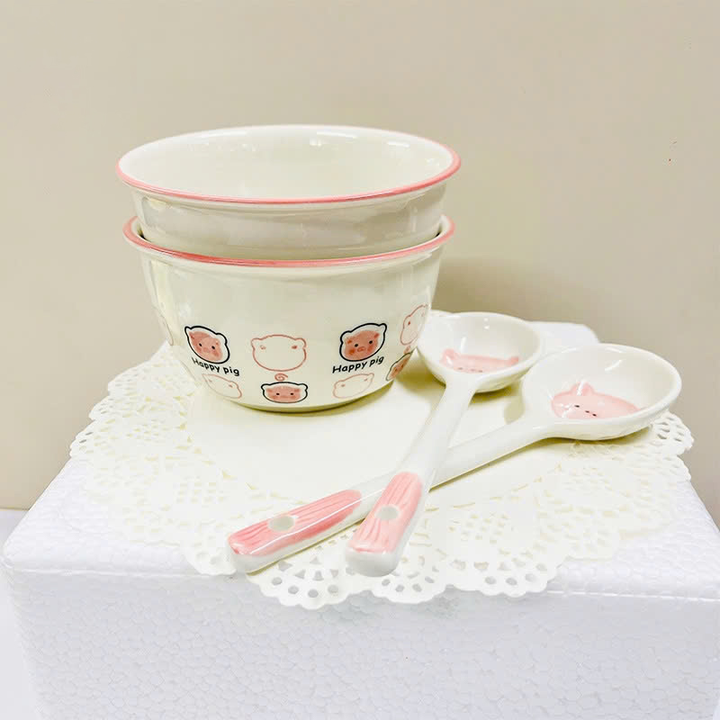 Set 2 Chén Sứ Cao Cấp – Bát Họa Tiết Heo Hồng Dễ Thương Kèm Muỗng 6.4×11.4cm