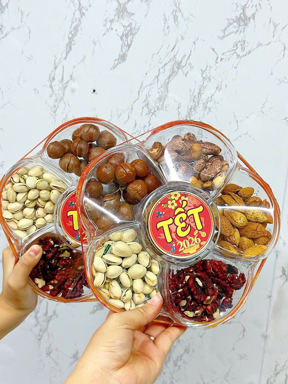Sỉ set Hộp Mix Hạt Ngũ Vị (Hạt Điều Rang Muối, Quả Óc Chó Vàng, Quả Óc Chó Đỏ, Macca, Hạt Dẻ Cười, Hạnh Nhân Rang Bơ) Bông Mai 600G Hộp Tết 2026