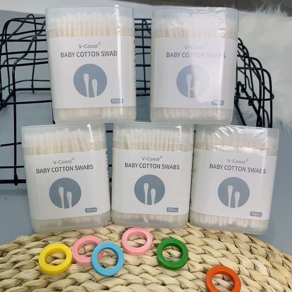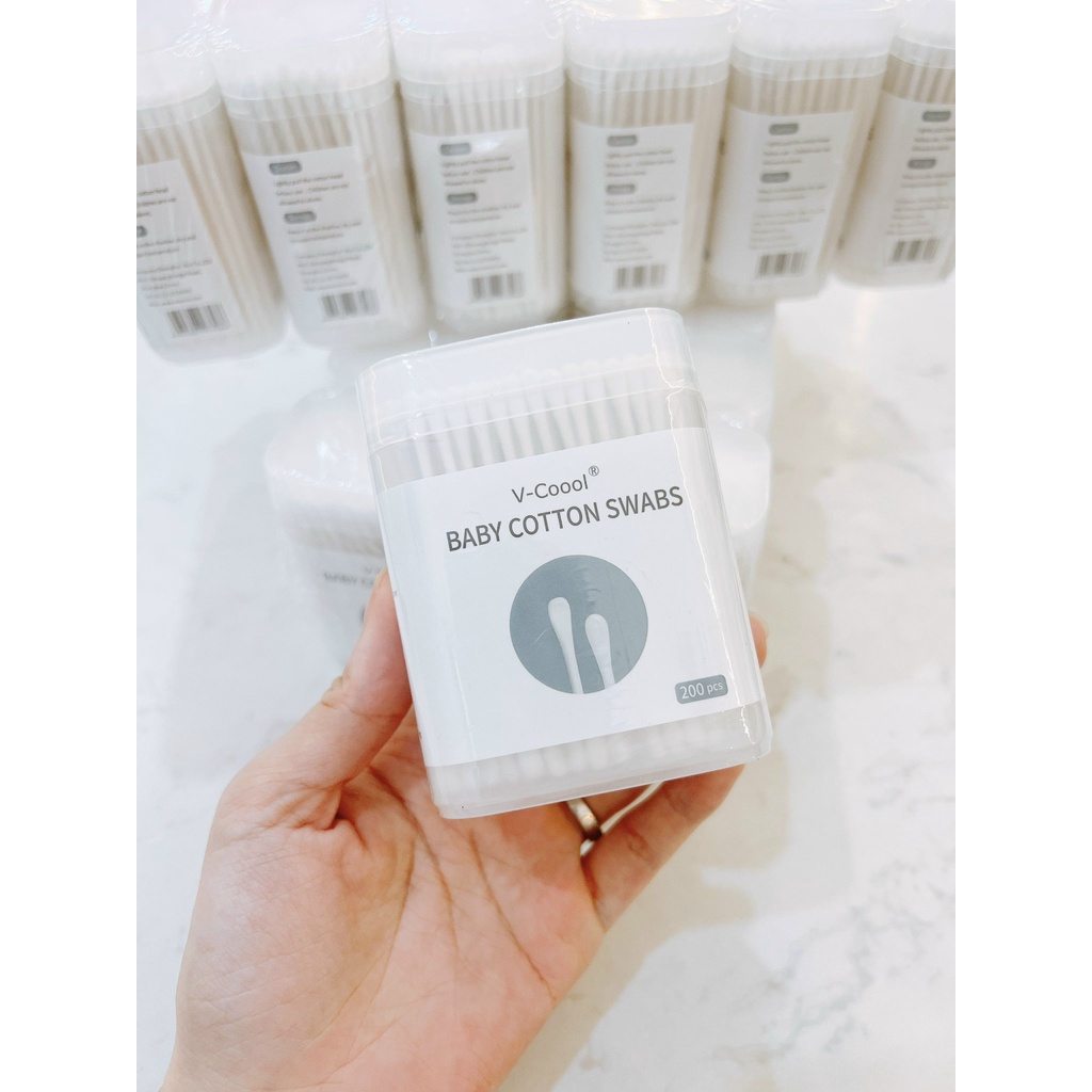 Hộp 200 Tăm Bông Ngoáy Tai – Tăm Bông Vcool 2 Đầu Tròn Và Dẹt Cho Bé 8x6x3.5cm